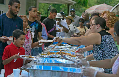 Everybody was moving. Children tumbled in a supersize moon bounce while tables upon tables of family dug into sauce-soaked racks of barbecue ribs and fluffy mounds of potato salad. The ones who weren’t eating were line-dancing – at least trying to – as knots of old men laughed at each other’s tall tales.
