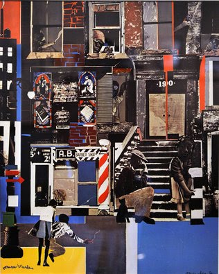 To end the show, also with a bang, Harris used work by Bearden. Here is a not-seen-before print, “Harlem Street Scene,” with people gathered before a barber shop and a holiness church.