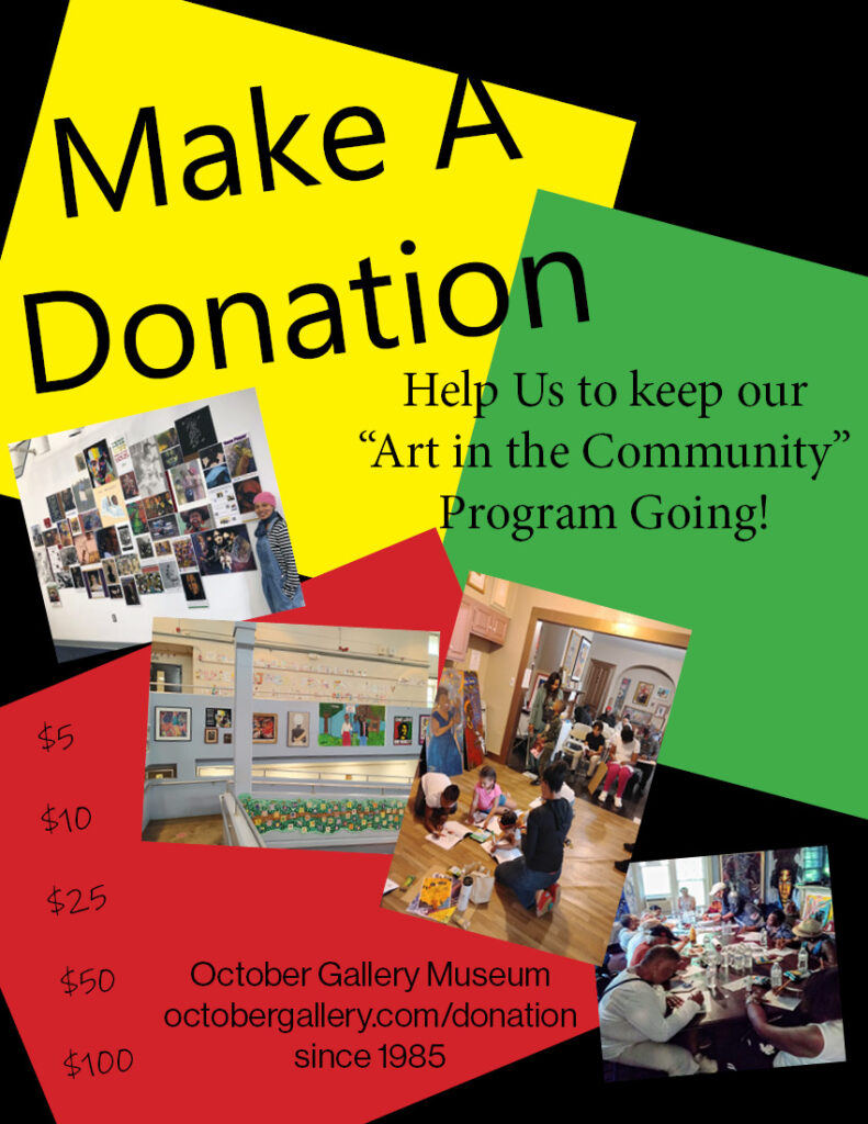 October Gallery Museum installs and places art, prints and posters in schools, recreation/cultural centers, business offices, universities, grocery stores and more within the community. Art is to be experienced at many levels everyday. It is just as important as the drug store, the gas station, the food market.