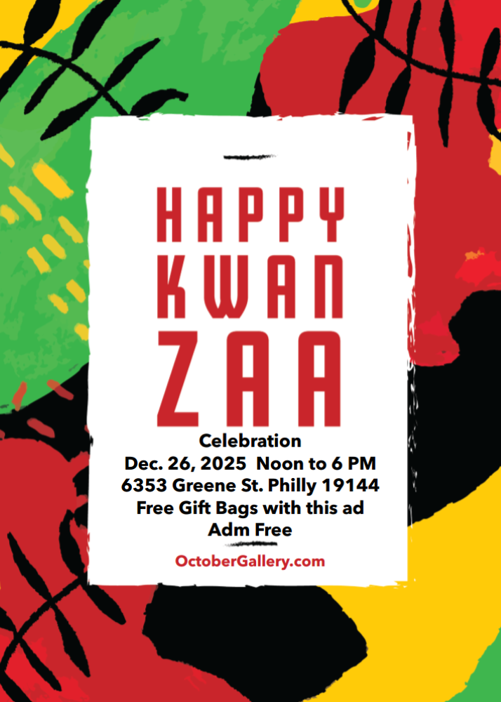 Free Coloring Poster for Kids and Adults. We supply the Black and White coloring poster (11″ x 17″) with crayons & pencils and you color it in. All supplies are free as part of Kwanzaa Celebration 12/26/25 Noon to 6 PM. 6353 Greene St. Philly 19144. Help us celebrate Black Philadelphia 250. Adm. Free.