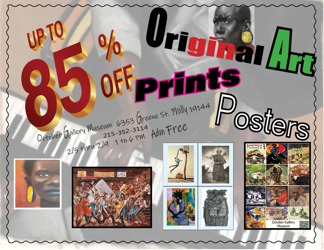 Up to 85 % Off on Original art, prints and posters. Starting Thursday 2/5 thru Monday 2/9 time - 1 to 6 PM Admission Free Free Giveaways! October Gallery Museum 6353 Greene Street Philly 19144 215-352-3114 While Supplies Last !!! First Come First Served !!! Black Philly 250 Poster Reg. $15 Sale $2 Now It's …