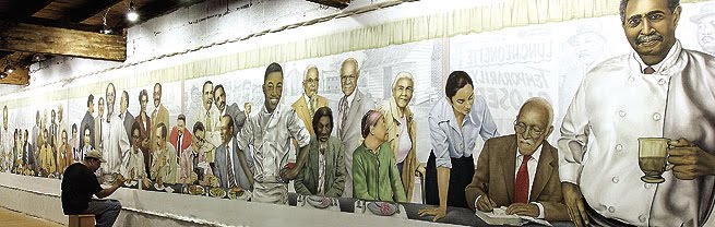 That Woolworth’s lunch counter in Greensboro, N.C., recently became the International Civil Rights Center and Museum. The sit-in is the inspiration for Charleston artist Colin Quashie’s enormous new painting, “Service,” which was unveiled last week at the University of North Carolina’s School of Government at Chapel Hill in an event that coincided with the 50th anniversary of the desegregation of the Greensboro Woolworth’s.
