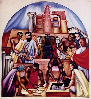 The Art of the Negro murals were painted by Hale Aspacio Woodruff (1900-1980) and consist of six canvas panels housed in the atrium of Trevor Arnett Hall. Woodruff, art professor and founder of the Atlanta University art department and permanent collections painted the series between 1950-1951. Woodruff intended to provide students of an historically black university, and its visitors, with images of black Americans’ cultural past. Referring to his motive for painting the murals, Woodruff stated: